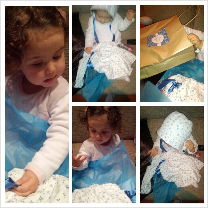 A M. adoraaaa receber roupitas! É vaidosa, sim senhora, e como! Fica feliz quando se arranja e lhe dizemos que está bonita...encolhe-se toda e desfaz-se em risinhos. Então, quando é presenteada com roupas, já sabe que mais cedo ou mais tarde, vai rolar elogio.