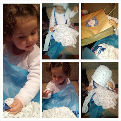 Lá estava ela, acabadinha de acordar do sono da tarde, quando lhe entreguei a saca da loja Azul Inglês. Meninos e meninas, só visto! A M. levava as mãozinhas à boca e era toda felicidade, a dizer "OoOoH"! Abriu aquilo tudo sem pressa, apenas mostrando surpresa e alegria: "Oooohhhh...!". Lol lol lol. :p